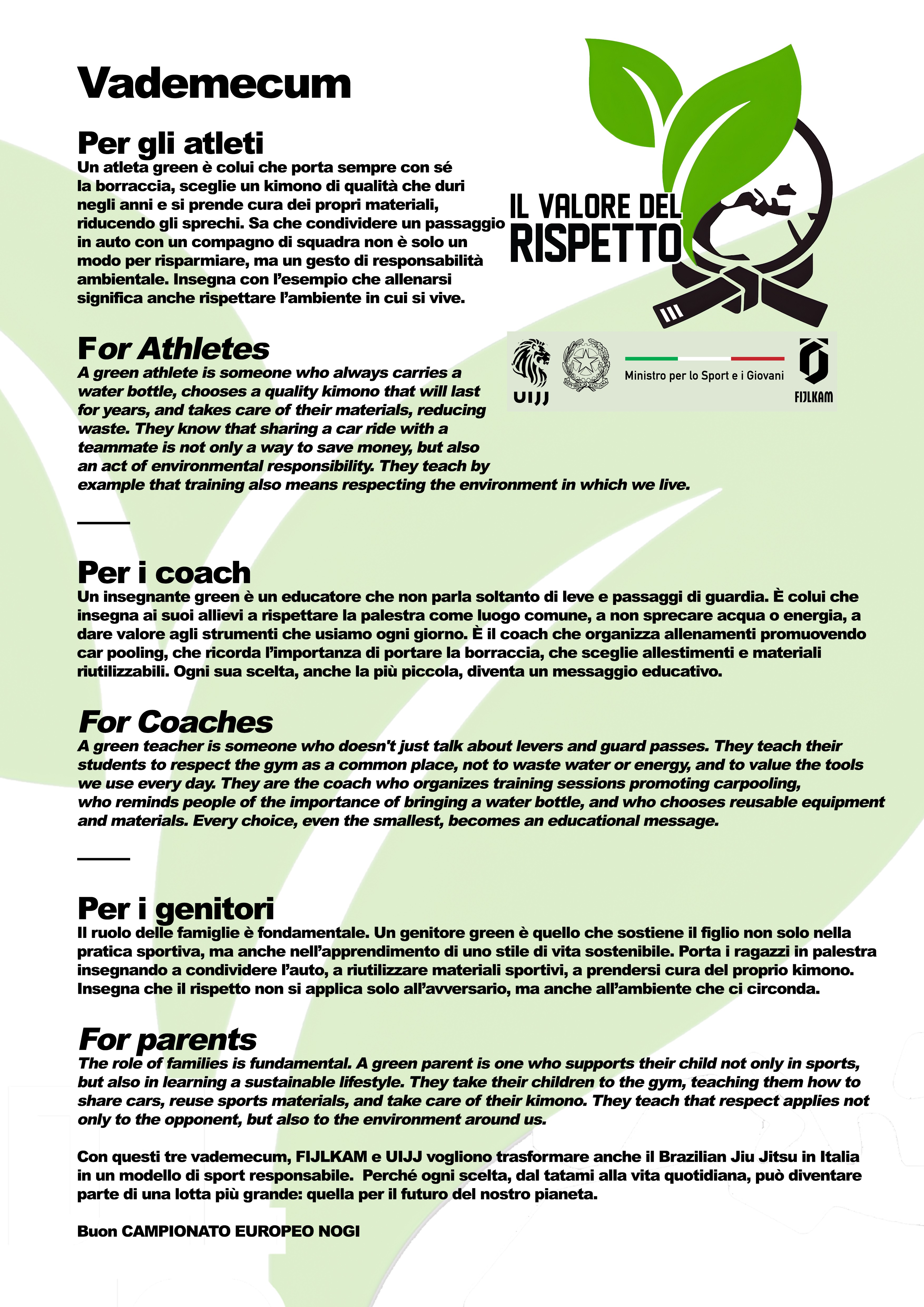 Non si tratta soltanto di norme o regolamenti: è una cultura da costruire. Significa imparare a viaggiare insieme per ridurre le emissioni, valorizzare i kimono di qualità invece di consumarne troppi, insegnare ai bambini che spegnere una luce o chiudere bene l’acqua delle docce fa parte della stessa etica che ci porta a rispettare l’avversario.